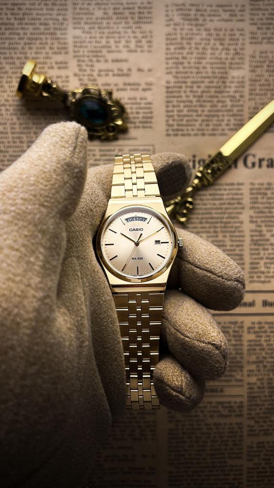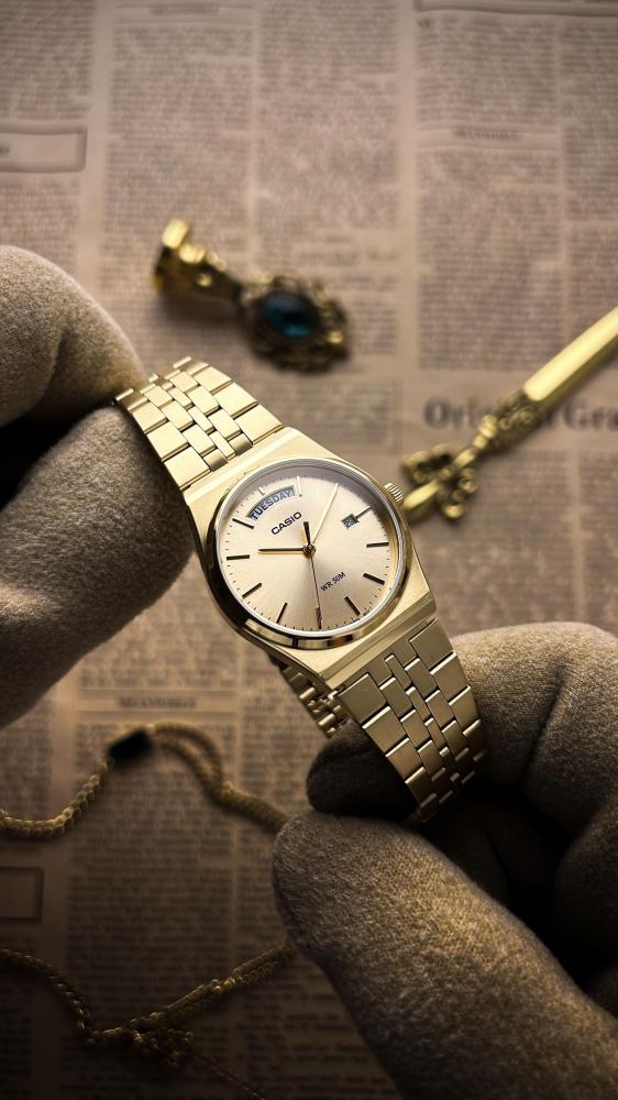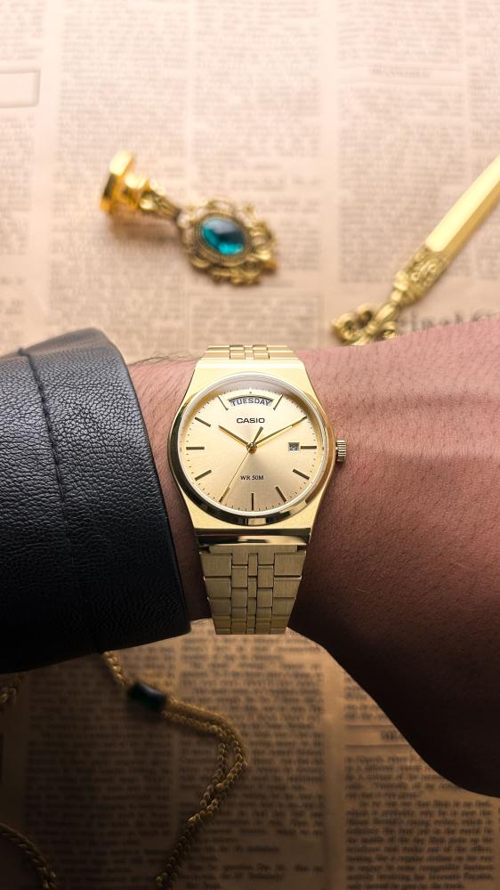 "ارتقِ بإطلالتك مع ساعة كاسيو الأنيقة والمميزة بمينا ذهبي جذاب وسوار معدني ذهبي يعكس الفخامة والبساطة في آن واحد. تتميز هذه الساعة بمقاومة للماء حتى عمق 50 متر، ما يجعلها مثالية للاستخدام اليومي وفي النشاطات المختلفة. تصميمها الكلاسيكي مع عرض للتاريخ والأيام يجعلها خيارًا مثاليًا للمرأة والرجل العصري الذي يبحث عن الأناقة والعملية في آن واحد. اجعل هذه الساعة جزءًا من إطلالتك اليوم."