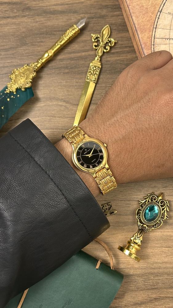 - المواد: هيكل من الستانلس ستيل (المطلي بالذهب عيار 18K) مع حزام من الستانلس ستيل المقاوم للصدأ.