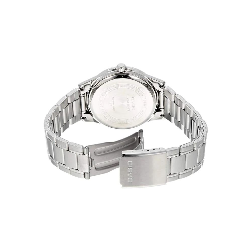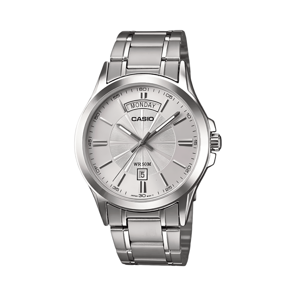 تصميم راقٍ بميناء ابيض , مزودة بعقارب وأرقام فضية لامعة، وسوار ستيل أنيق. تتميز بعرض التاريخ واليوم بشكل واضح، مما يجعلها مثالية للاستخدام اليومي والم...