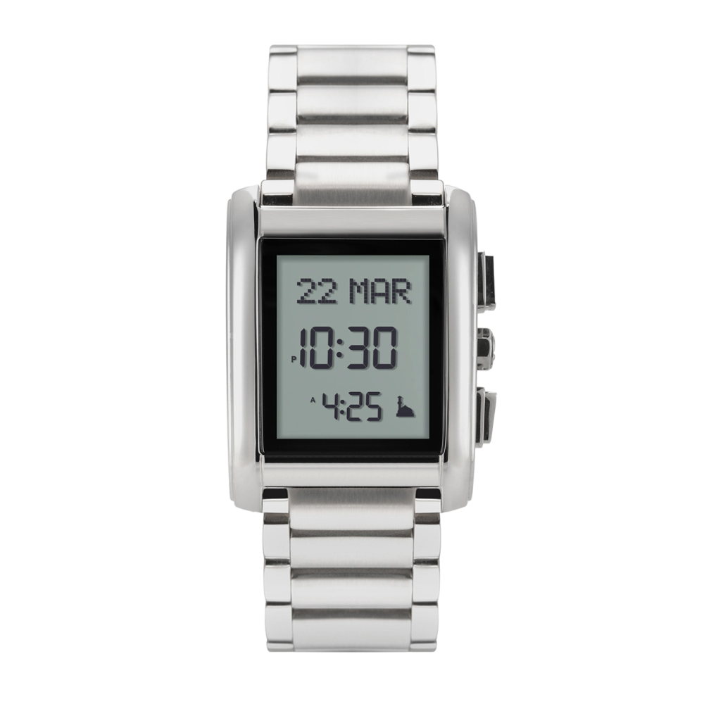 سـاعة كلاسيكية ذات هيكــل فضي مستطيل وحزام من الفولاذ المقاوم للصدأ، مــزودة بـشــاشـة بـلـوريـة ، مــع إضـاءة خلفيـة.خصائص الساعة:مواقيت الصلاة في جم...