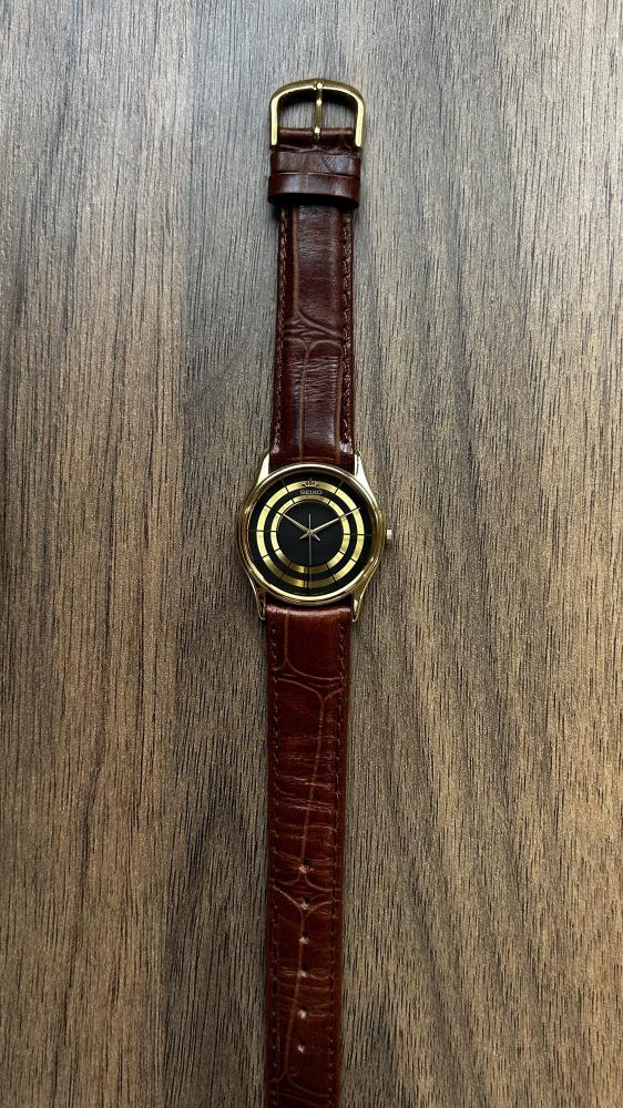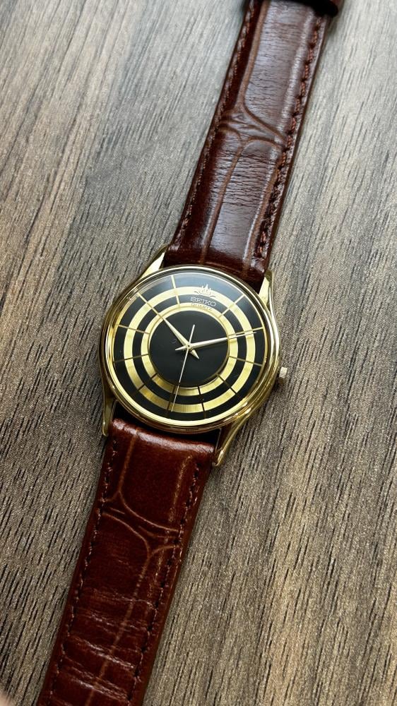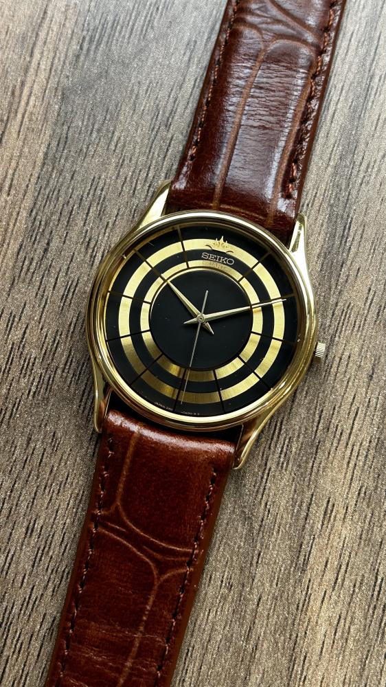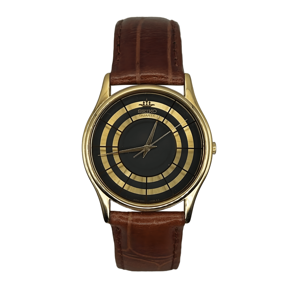 تقدم شركة سيكو مزيجًا رائعًا من الأناقة والرفاهية، حيث تأتي بتصميم كلاسيكي يعبر عن الفخامة بكل تفاصيله. الهيكل الذهبي اللامع والمينا الاسود المزين بنمط ديكوري ذهبي دائري يمنحان هذه الساعة جاذبية لا تقاوم. العقارب الذهبية الرفيعة تضيف لمسة من البساطة المميزة، مما يجعلها قطعة فنية تليق بالذوق الرفيع. هذه الساعة ليست مجرد أداة لقياس الوقت، بل هي تعبير عن شخصية متألقة.