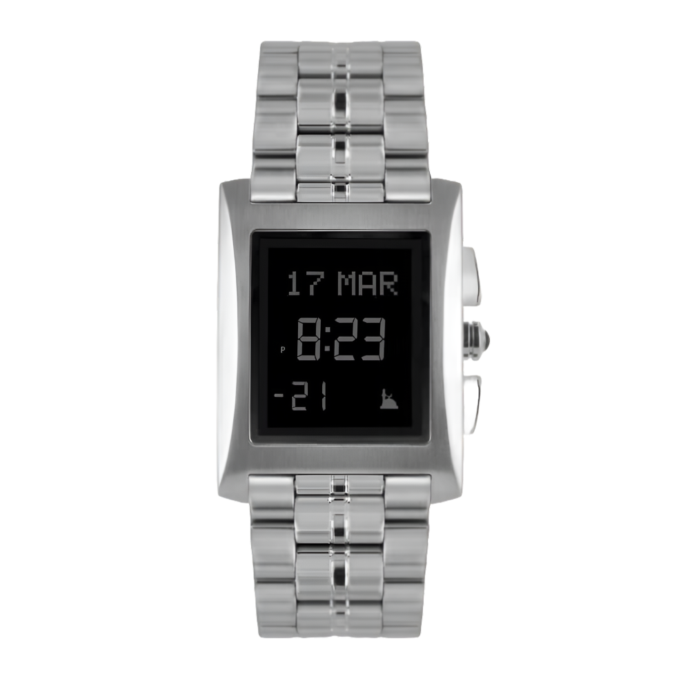 ساعة ذات هـيـكل فولاذي، مزودة بشاشة بلورية FSTN بحزام من الفولاذ المقاوم للصدأ.خصائص الساعة:مواقيت الصلاة في جميع مدن العالمبوصلة الكترونية لتحديد اتج...
