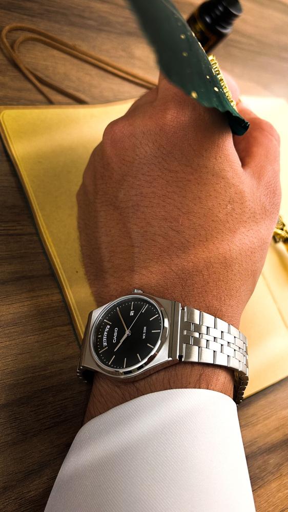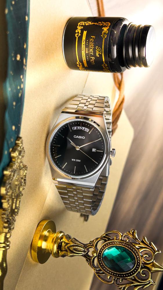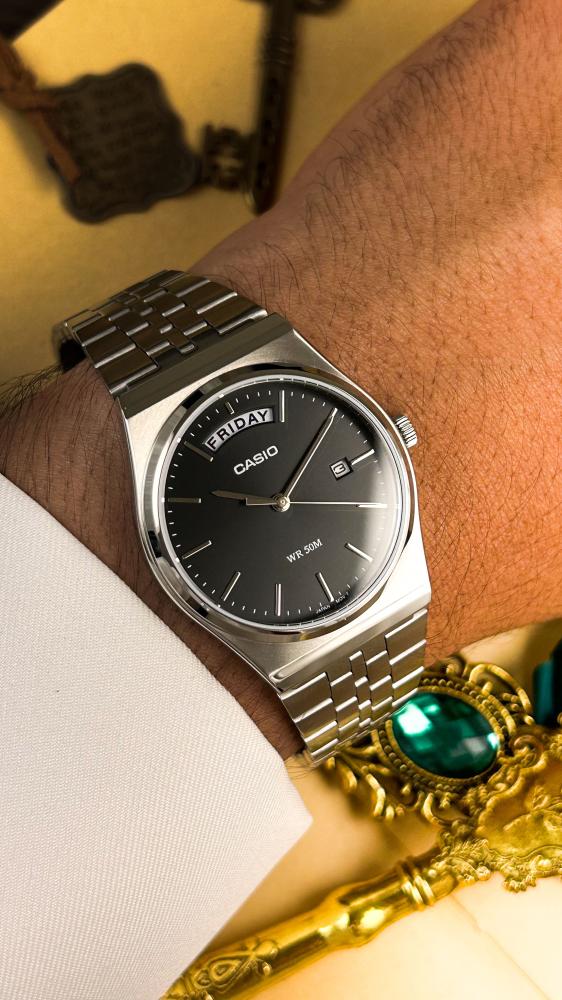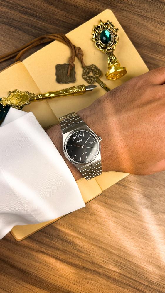 "ارتقِ بإطلالتك مع ساعة كاسيو الأنيقة والمميزة بمينا أسود جذاب وسوار معدني فضي يعكس الفخامة والبساطة في آن واحد. تتميز هذه الساعة بمقاومة للماء حتى عمق 50 متر، ما يجعلها مثالية للاستخدام اليومي وفي النشاطات المختلفة. تصميمها الكلاسيكي مع عرض للتاريخ والأيام يجعلها خيارًا مثاليًا للمرأة والرجل العصري الذي يبحث عن الأناقة والعملية في آن واحد. اجعل هذه الساعة جزءًا من إطلالتك اليوم."