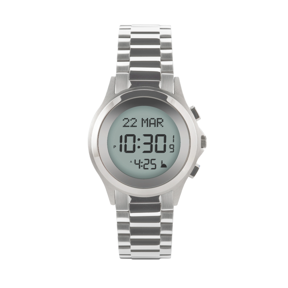 ســاعــة ذات إطــار دائري من الفولاذ اللماع، مــزودة بـشــاشــة بـلــوريــة FSTN وسيــر فــولاذي مقاوم للصدأ. متوفرة باللون الفضي.خصائص الساعة:مواقيت ...