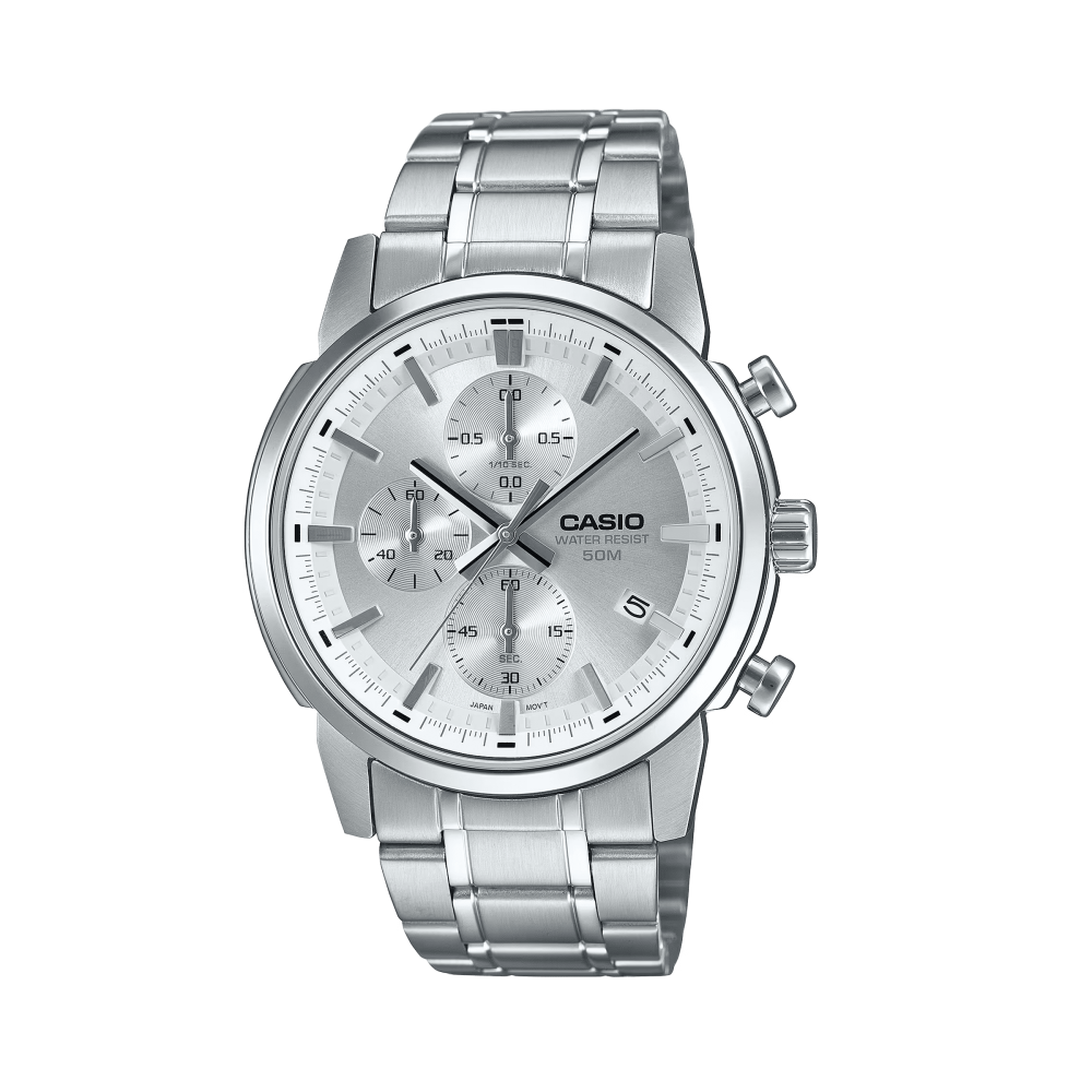 ساعة تناظرية معدنية رائعة بتصميم كرونوغراف رياضي تحبه وتوقيت دقيق تحتاجه. تعرض ثلاثة أقراص مدمجة ساعات توقيت منفصلة تقيس بالدقيقة والثانية و1/10 ثانية. مقاومة للماء حتى عمق 50 مترًا تحررك من القلق، حتى في الأيام الممطرة.