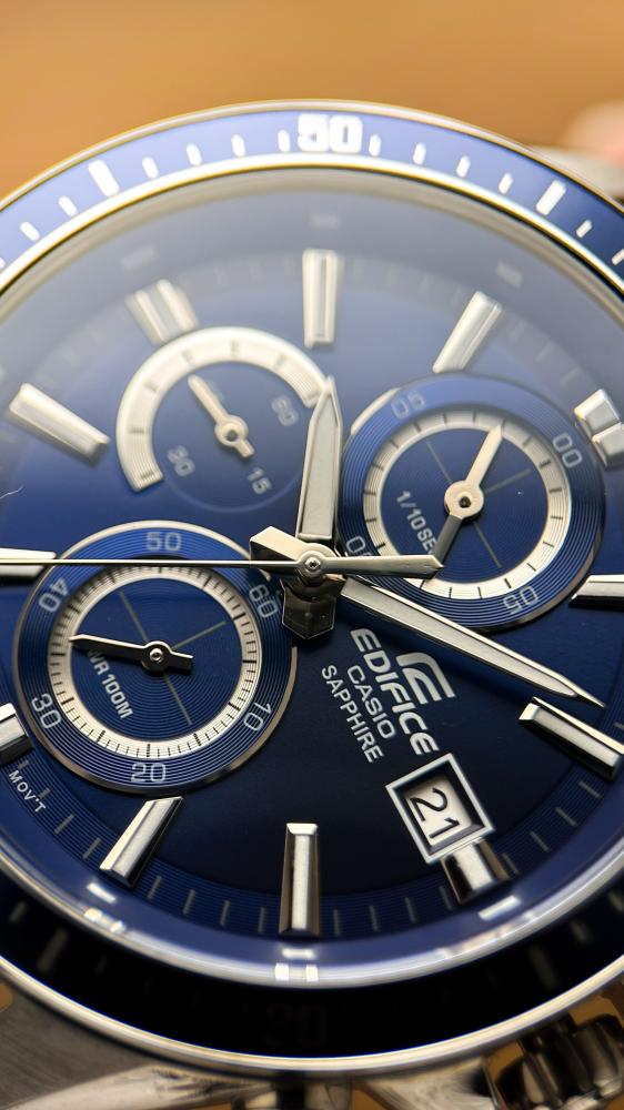 المينا باللون الازرق مع لمسات فضية وعقارب مطلية بمادة مضيئة لسهولة القراءة.