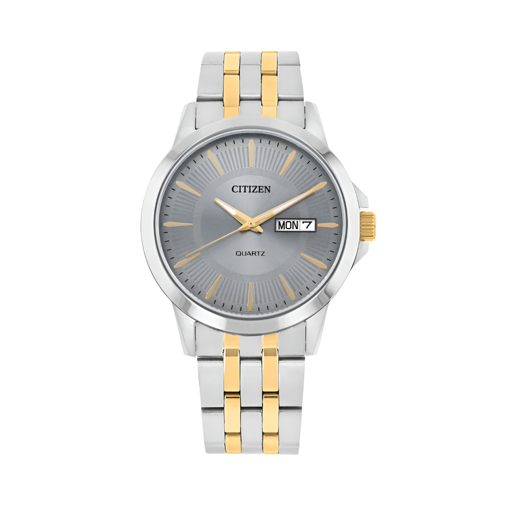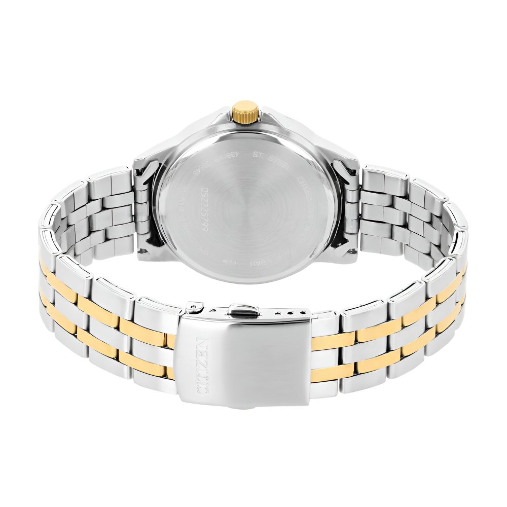 تتميز هذه الساعة من سيتيزن باللون الفضي والذهبي و بسوار ذا جودة عالية مصنوع من الفولاذ المقاوم للصدأ (ستانلس ستيل) وهيكل مصنوع من الفولاذ المقاوم للصدأ ايضًا.